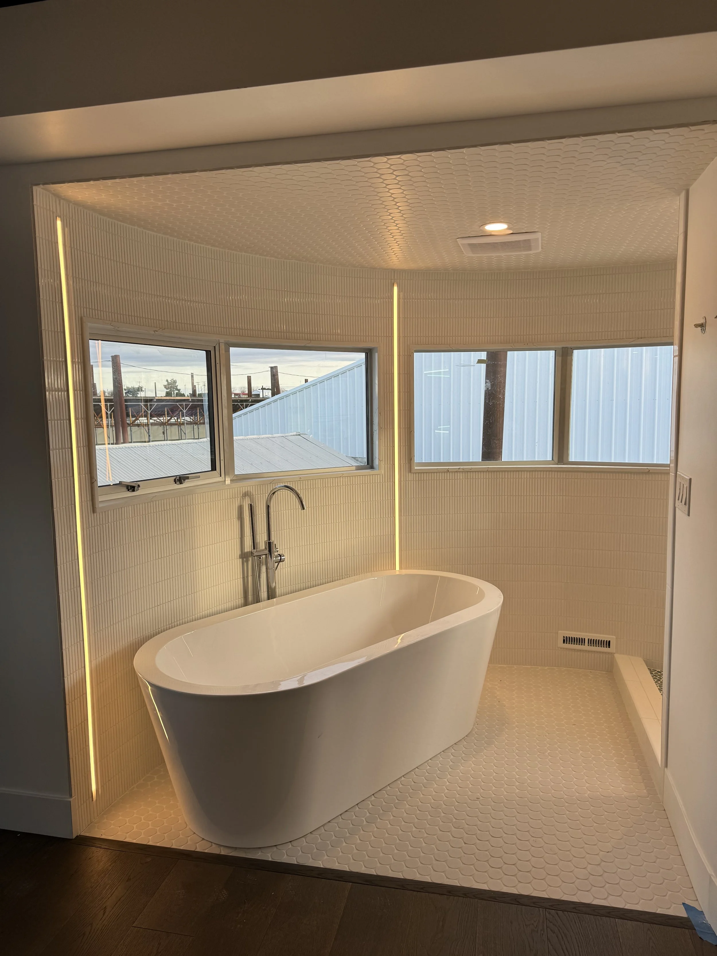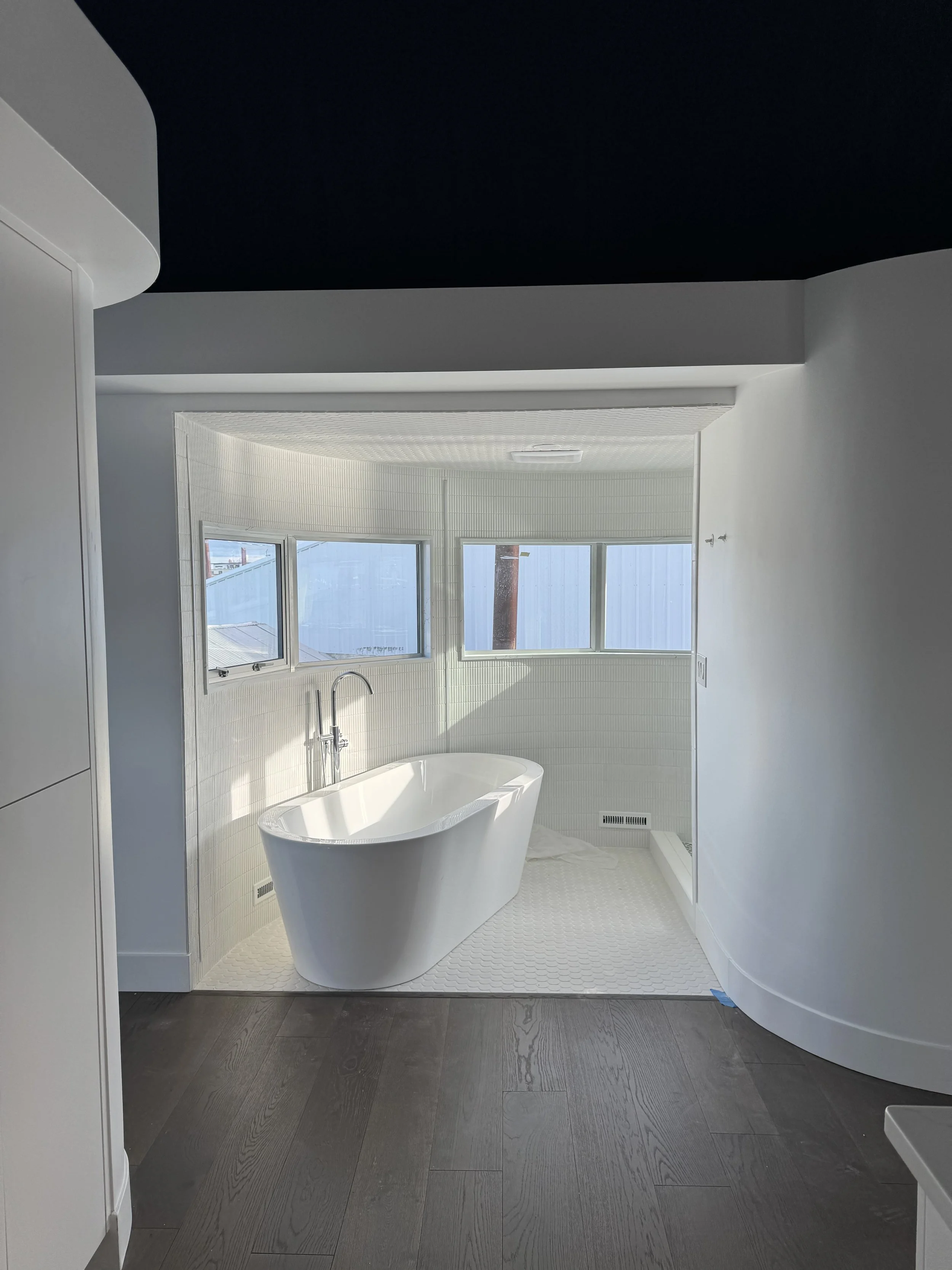 Modern bathroom with a standing bathtub near a wall of windows, with white tiles and wooden flooring.