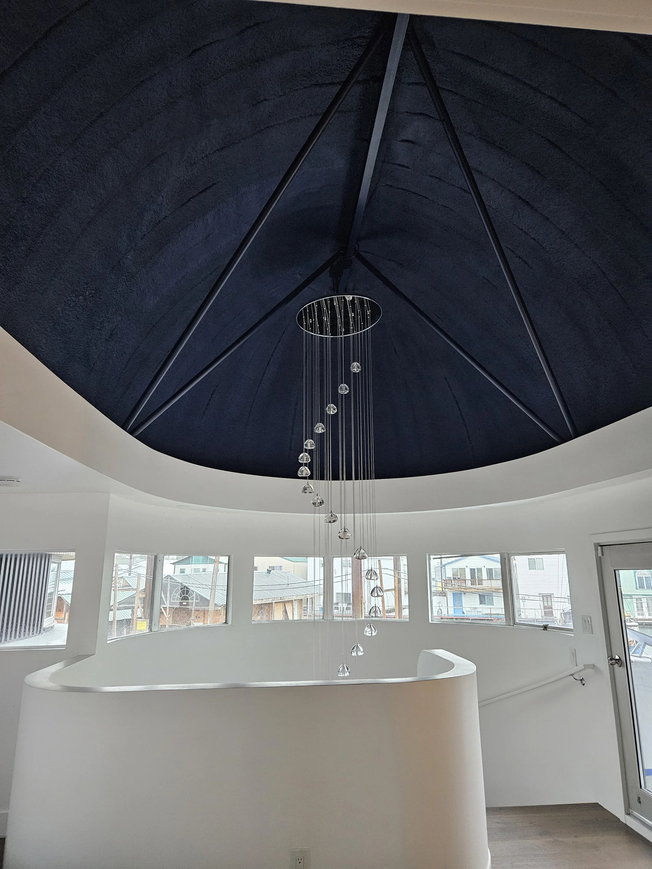 Interior view of a modern spiral staircase with dark wooden steps and a white curved railing. A contemporary chandelier with multiple hanging glass orbs is suspended from a black ceiling, and large windows with blue sky are visible at the top.
