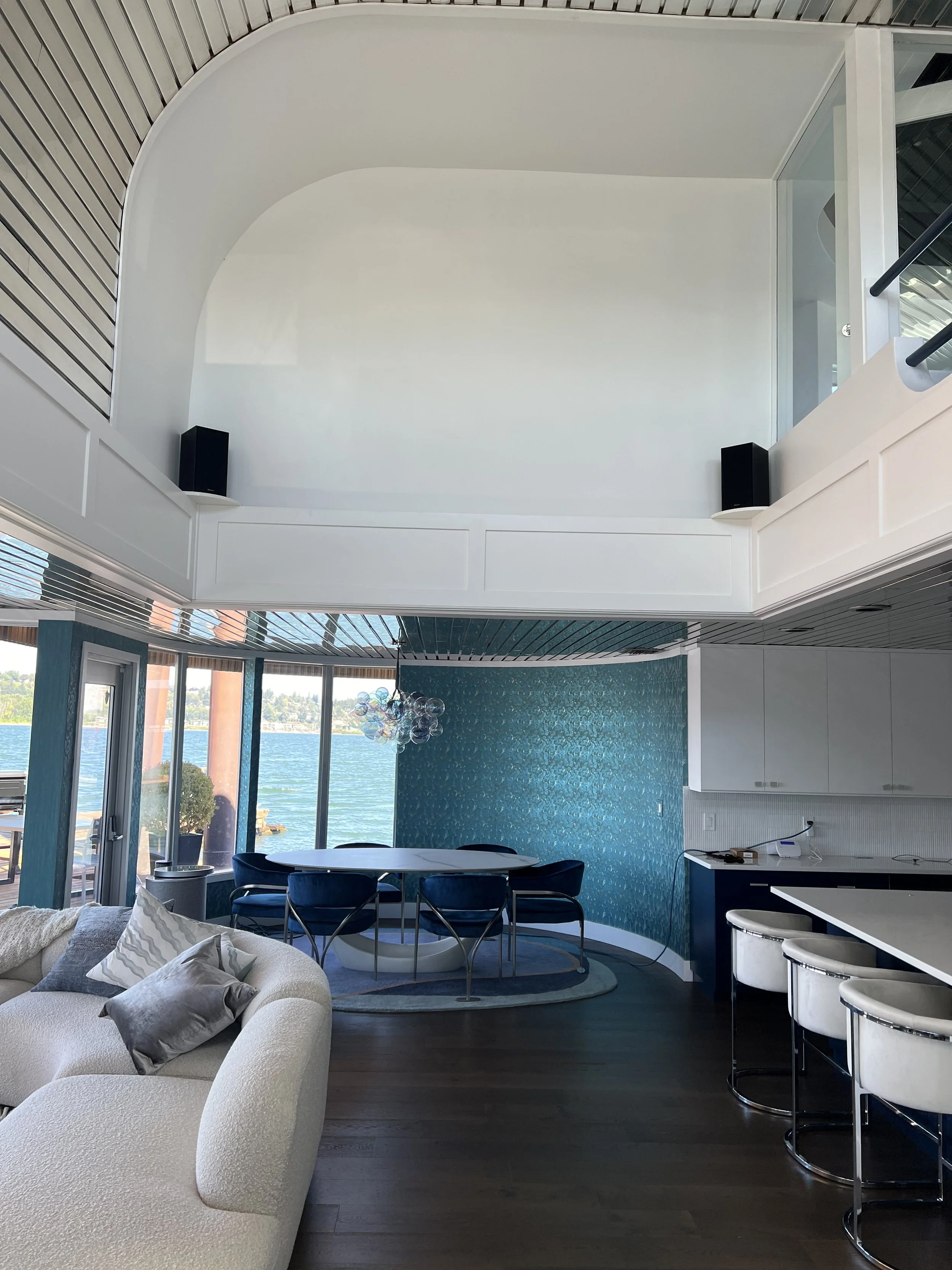 Modern open-concept kitchen and living room with a kitchen island, white chairs, pendant lighting, sofa with decorative pillows, side table with a potted orchid, and large window showing an outdoor view.