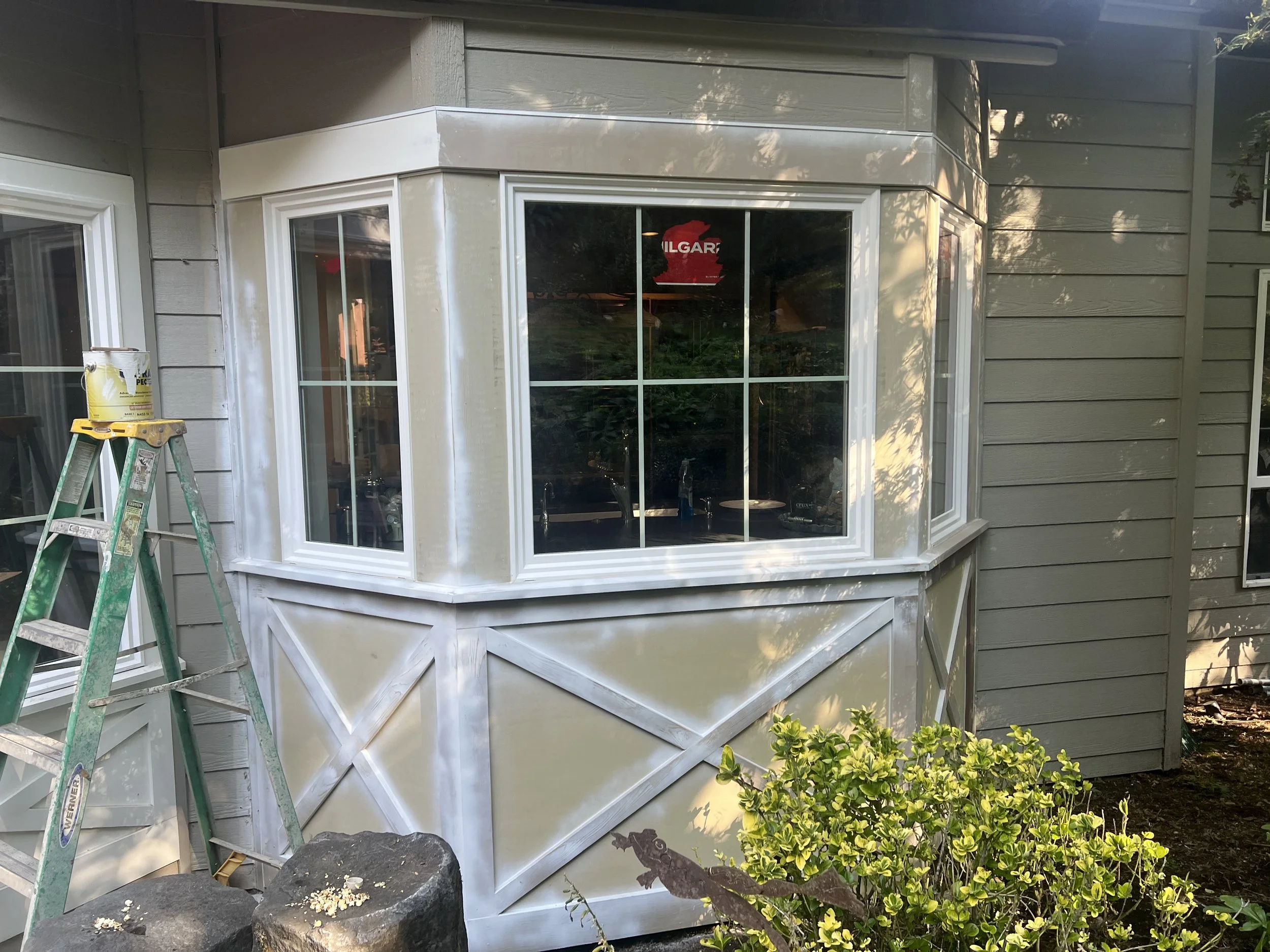 Close-up of a house exterior showing a bay window with white trim, part of a gray wall, a green shrub in front, and a ladder leaning against the house during daytime.