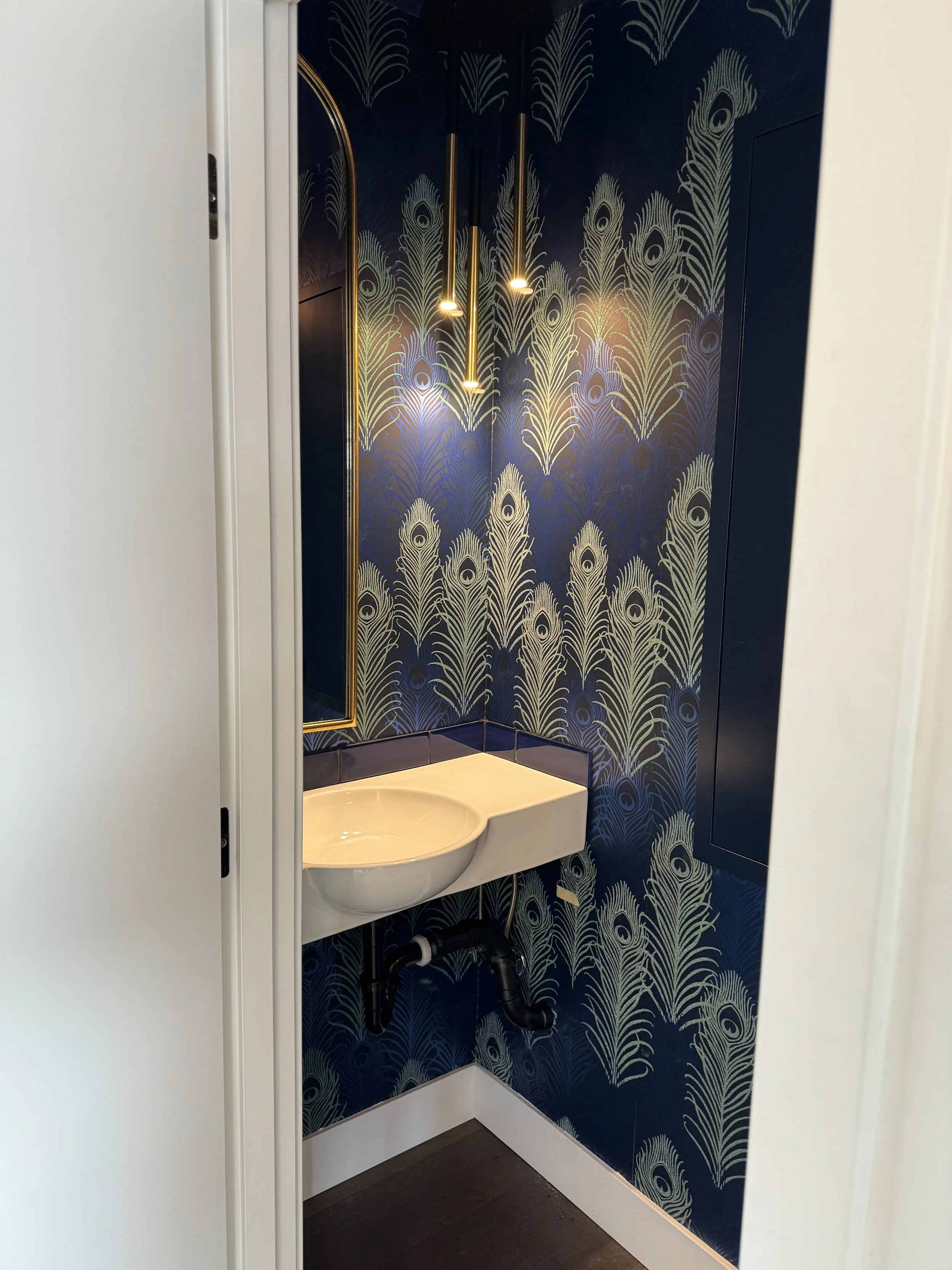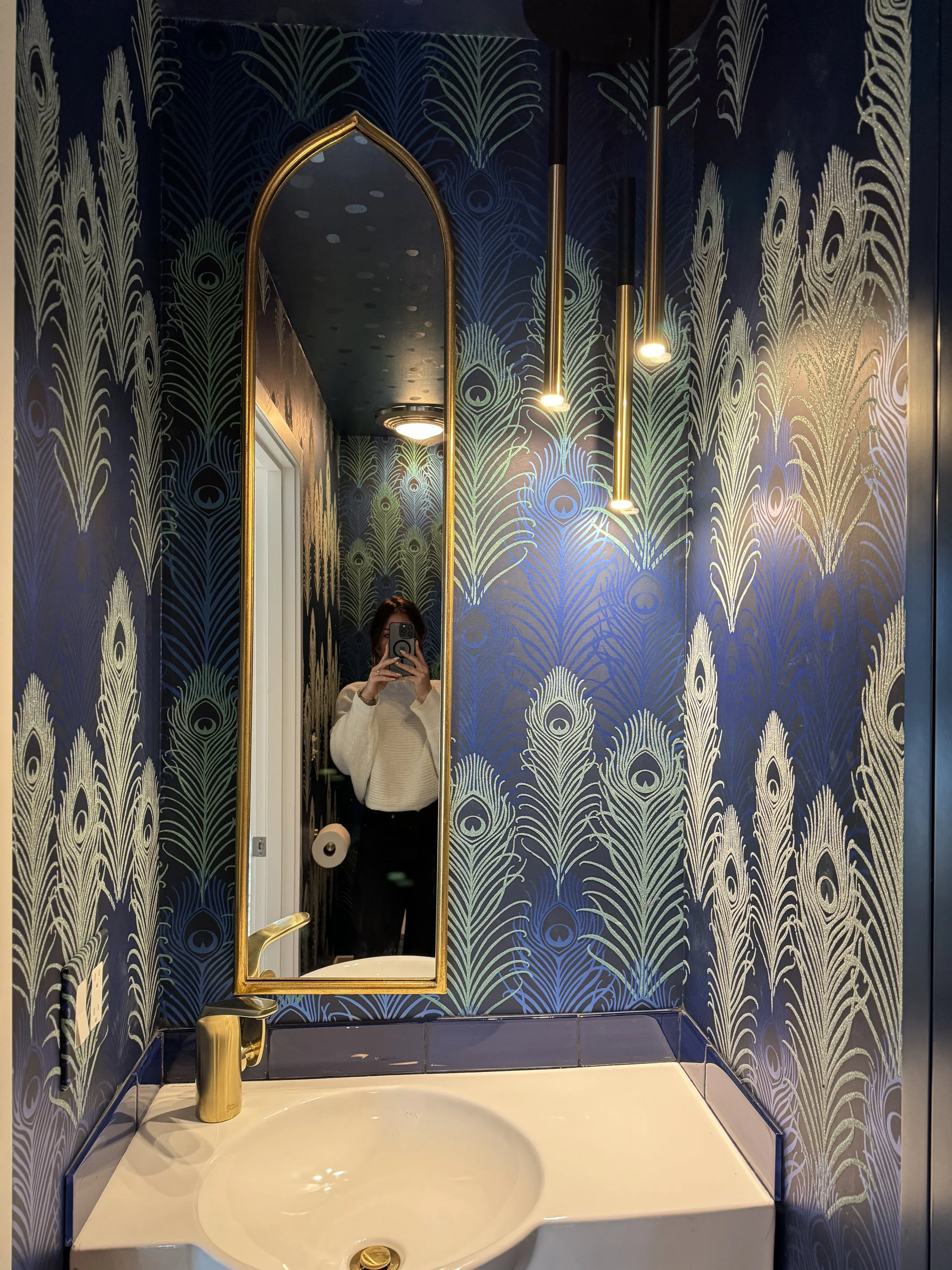 A bathroom vanity with a white sink, gold faucet, and peacock feather patterned wallpaper in blue, gold, and green. There is a tall, gold-framed mirror, and three hanging pendant lights. A person in a white sweater is taking a photo with their phone