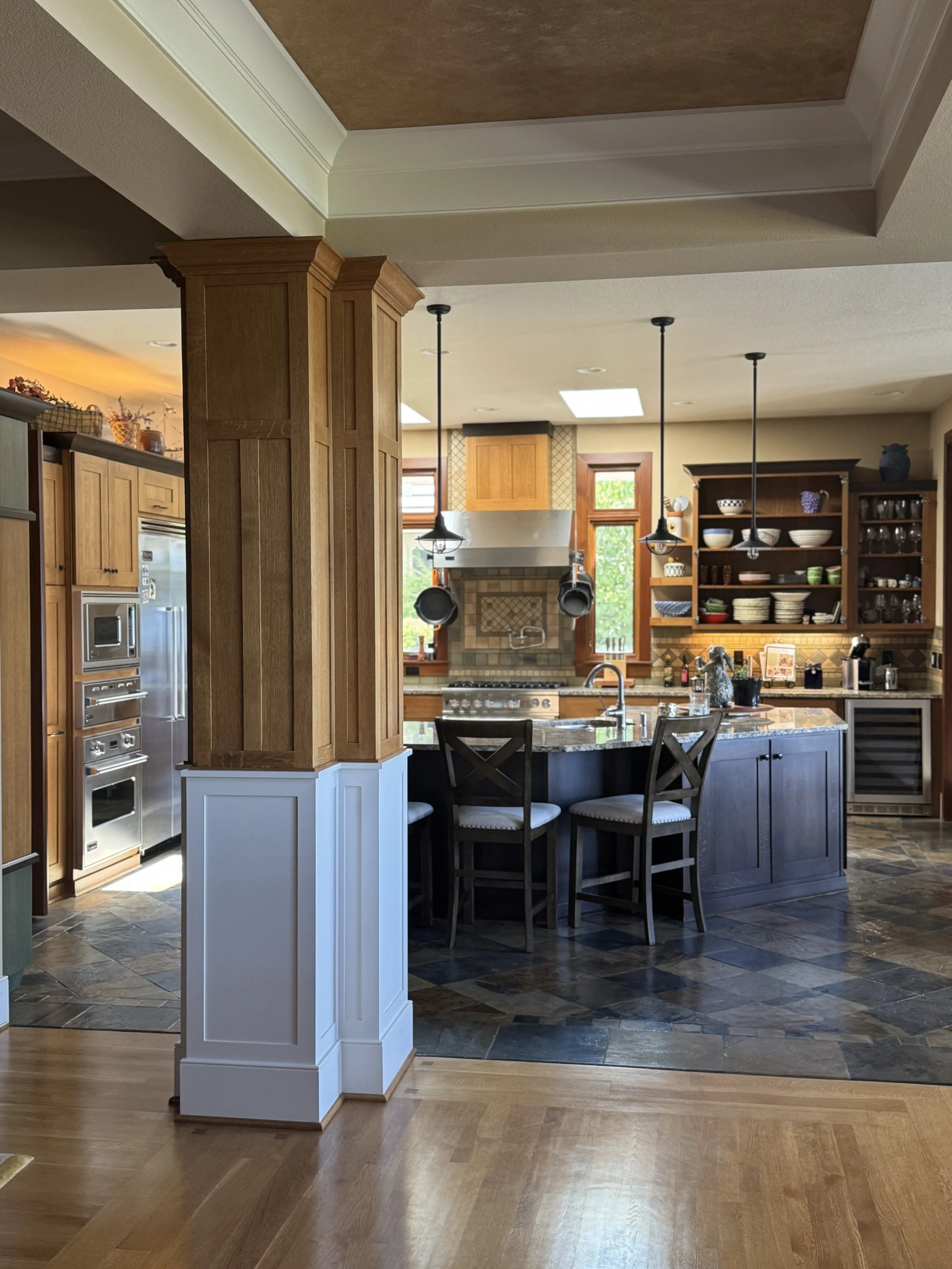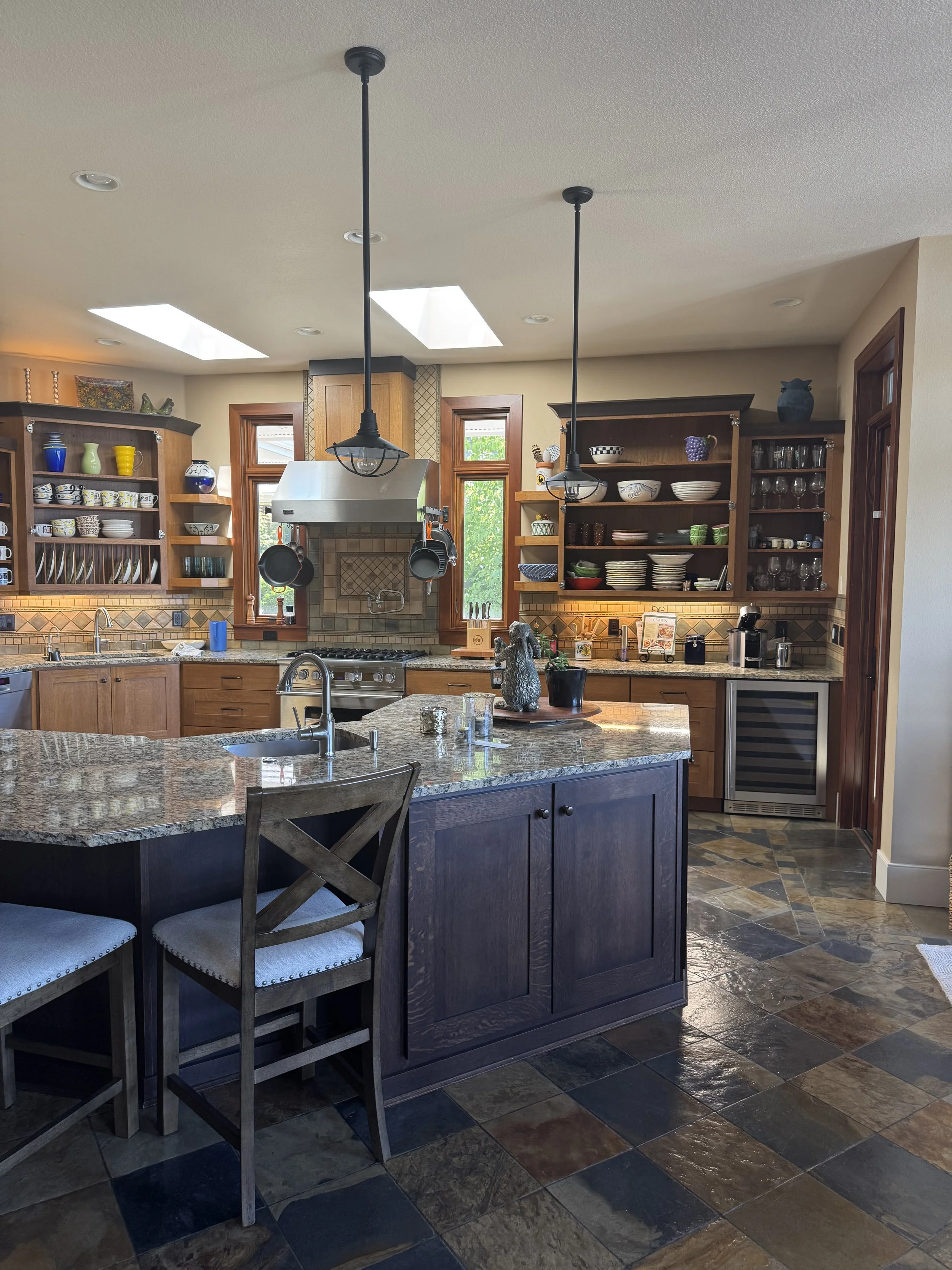 Interior view of a kitchen with wooden cabinetry, a central island with a granite countertop, and open shelves filled with dishes and glassware. Pendant lights hang above the island, and there are windows letting in natural light.