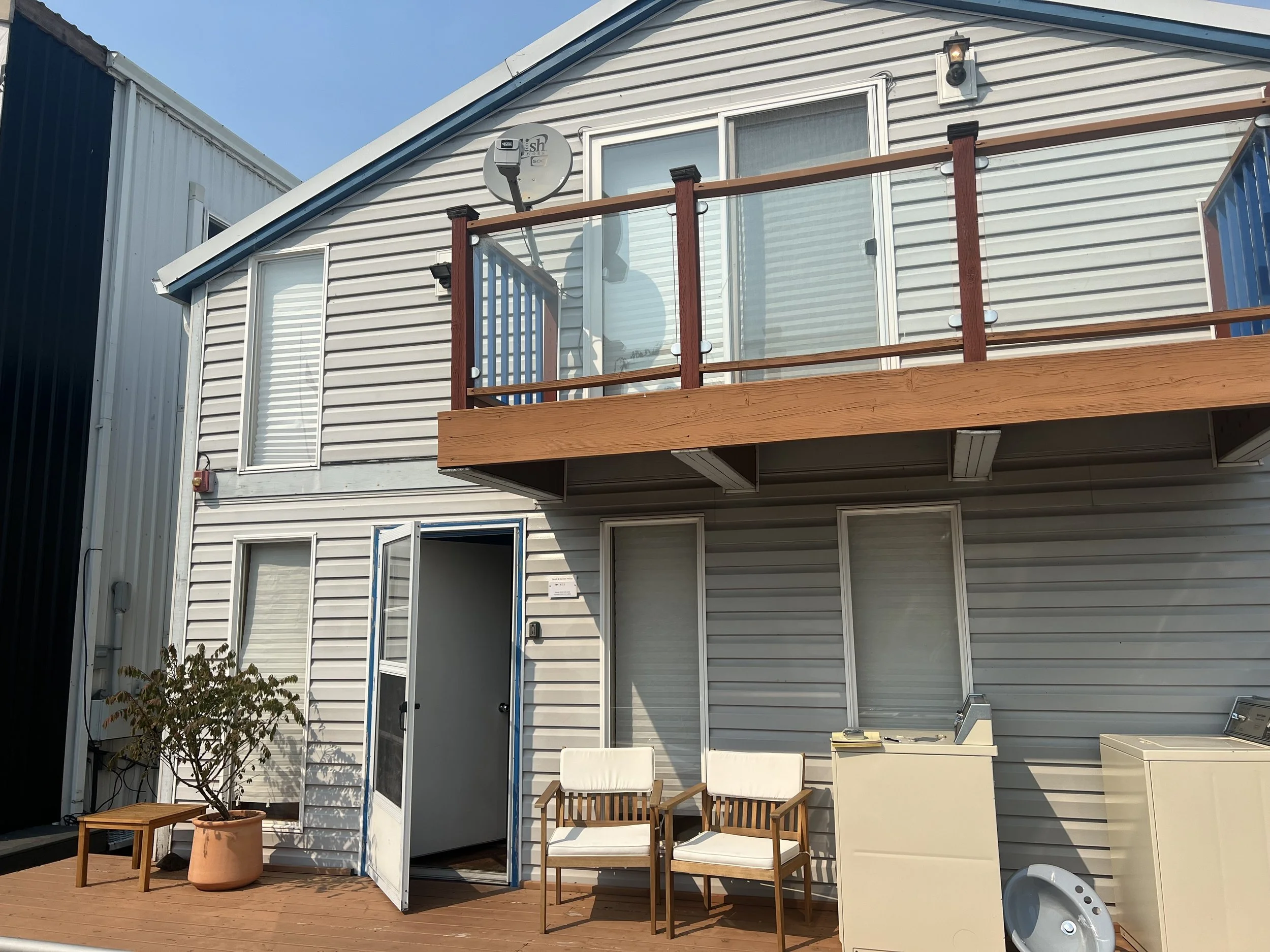 View of a house back porch with privacy glass doors, two tall gray columns supporting a small roof, potted plants, and a wooden deck.