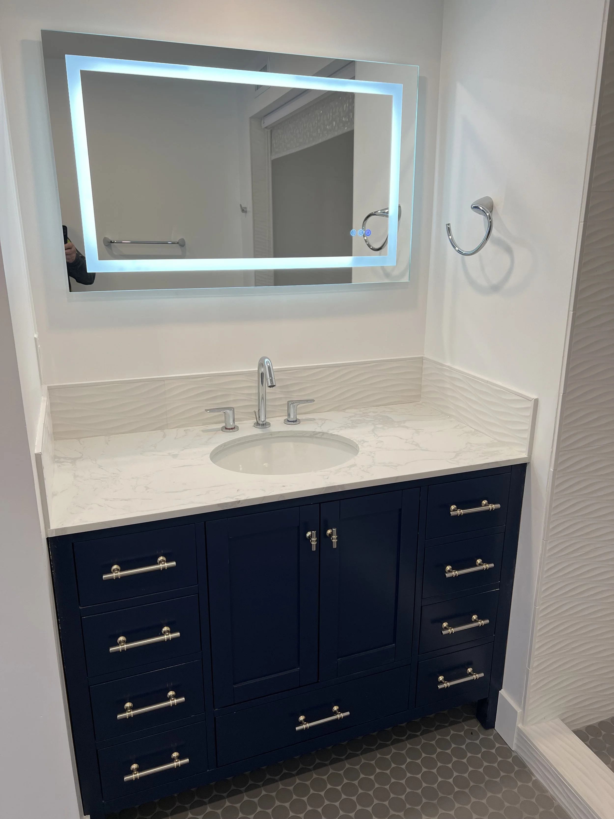 Modern bathroom with a glass shower enclosure, gray hexagonal tile walls, a white toilet, and a vanity with a vessel sink.