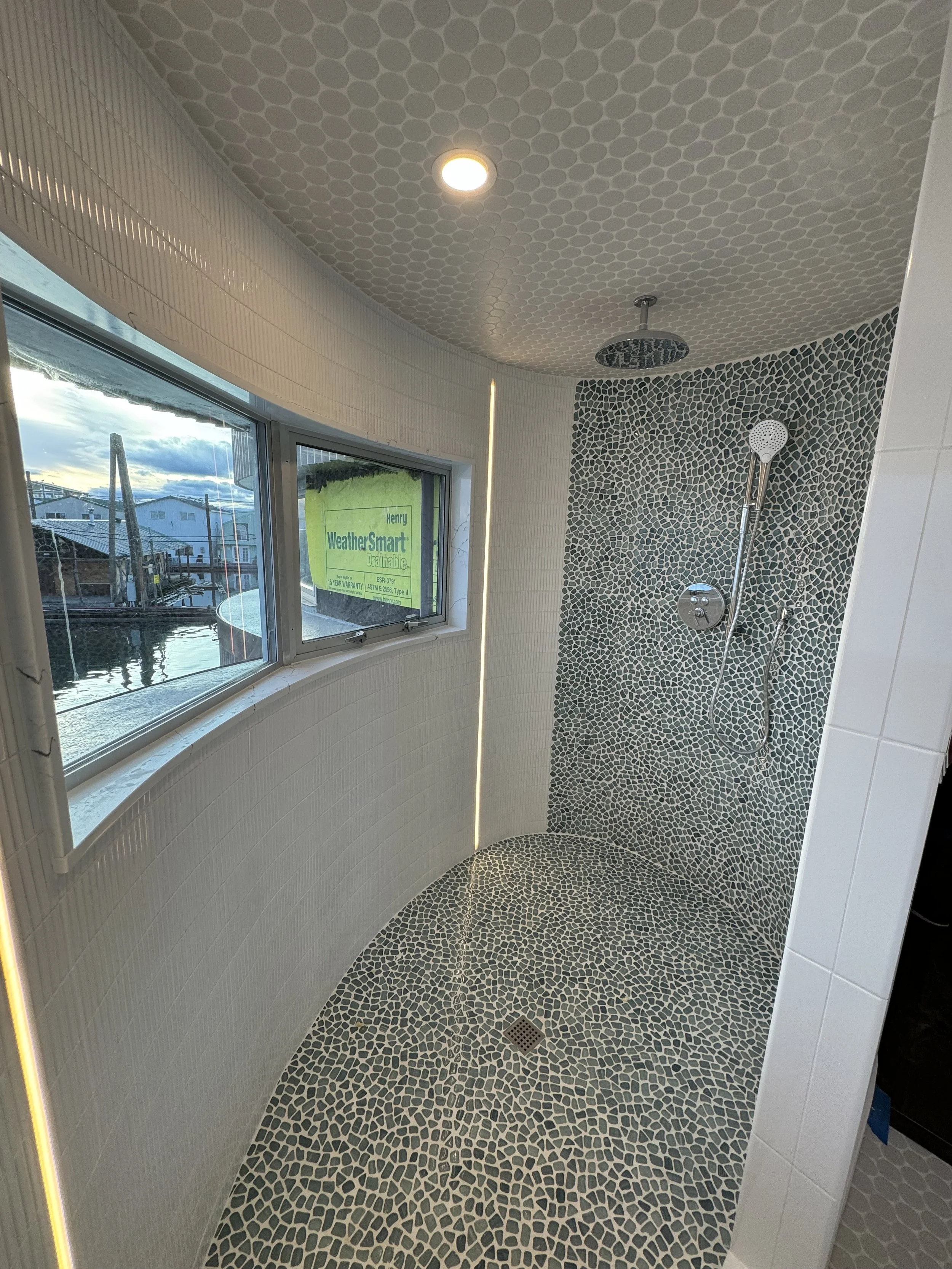 Modern walk-in shower with textured white tiled walls, a rain showerhead, a handheld shower, and dual body sprays, featuring a linear drain on the floor.