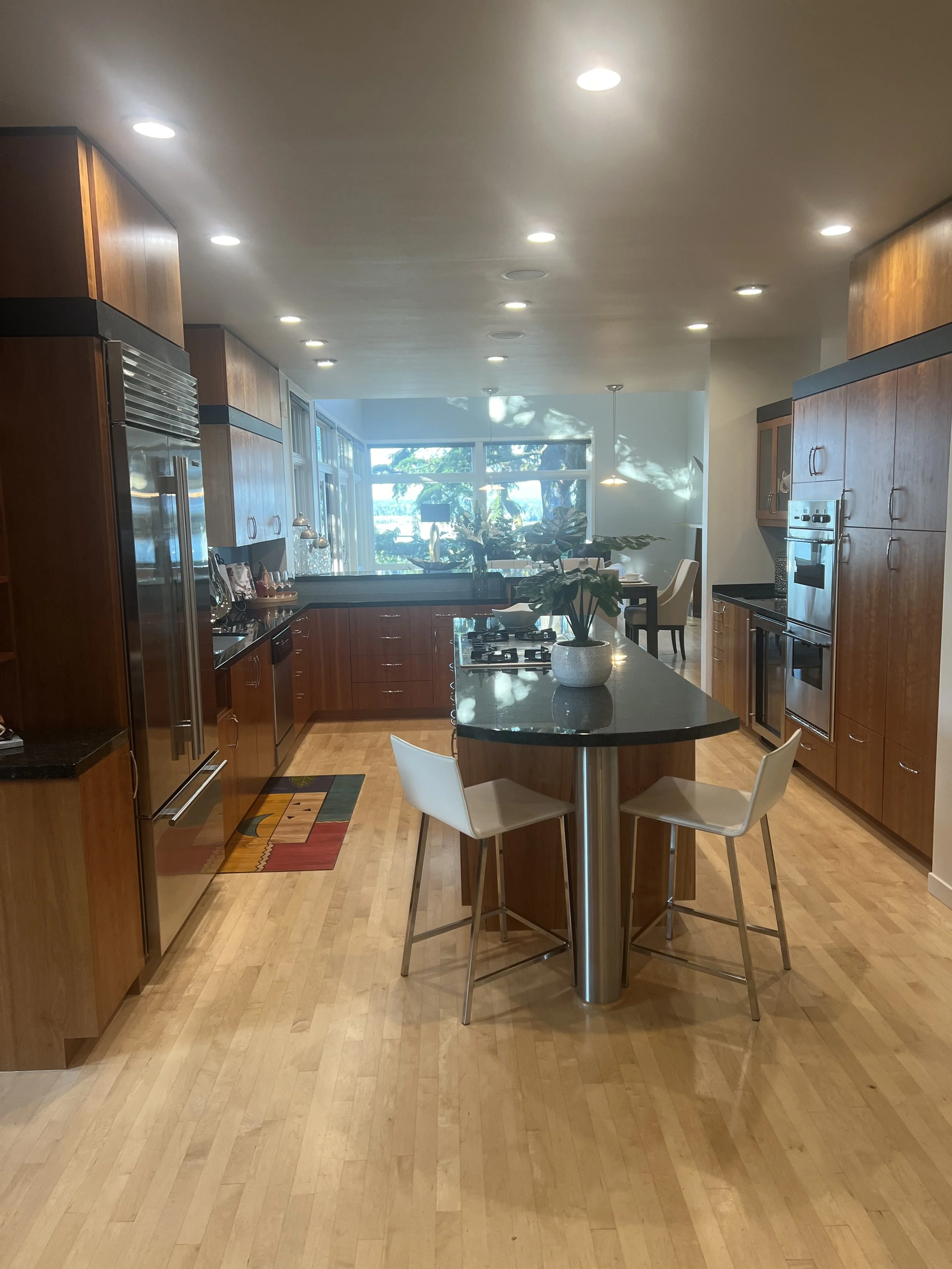Modern kitchen with wooden cabinets, granite countertops, a kitchen island, open shelving with dishes, and two pendant lights hanging from the ceiling.