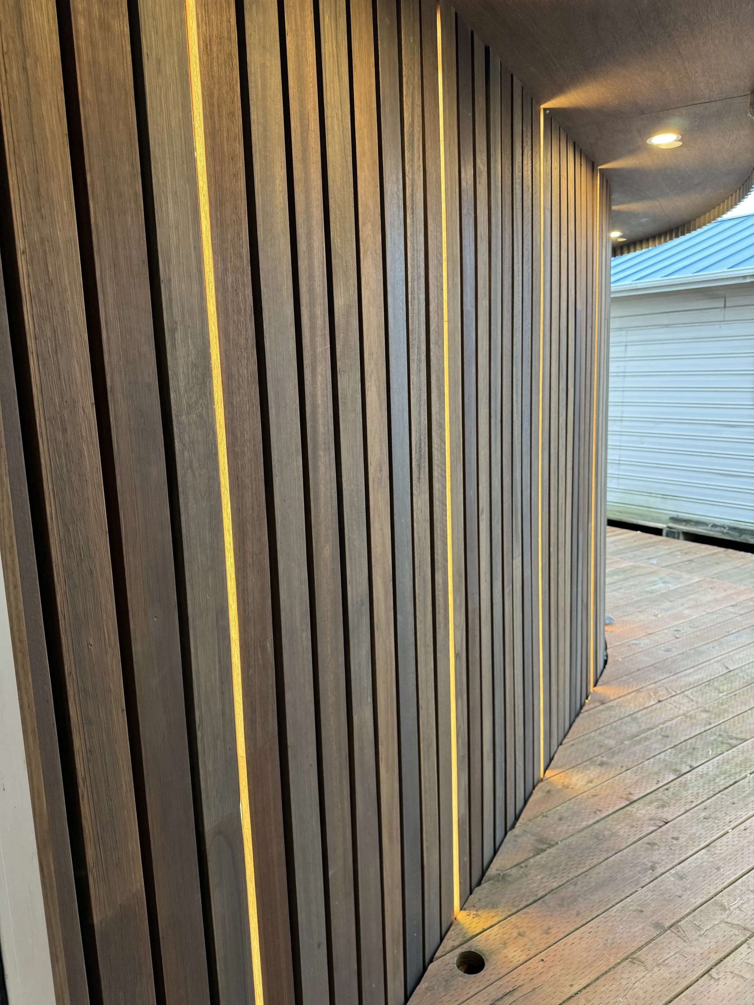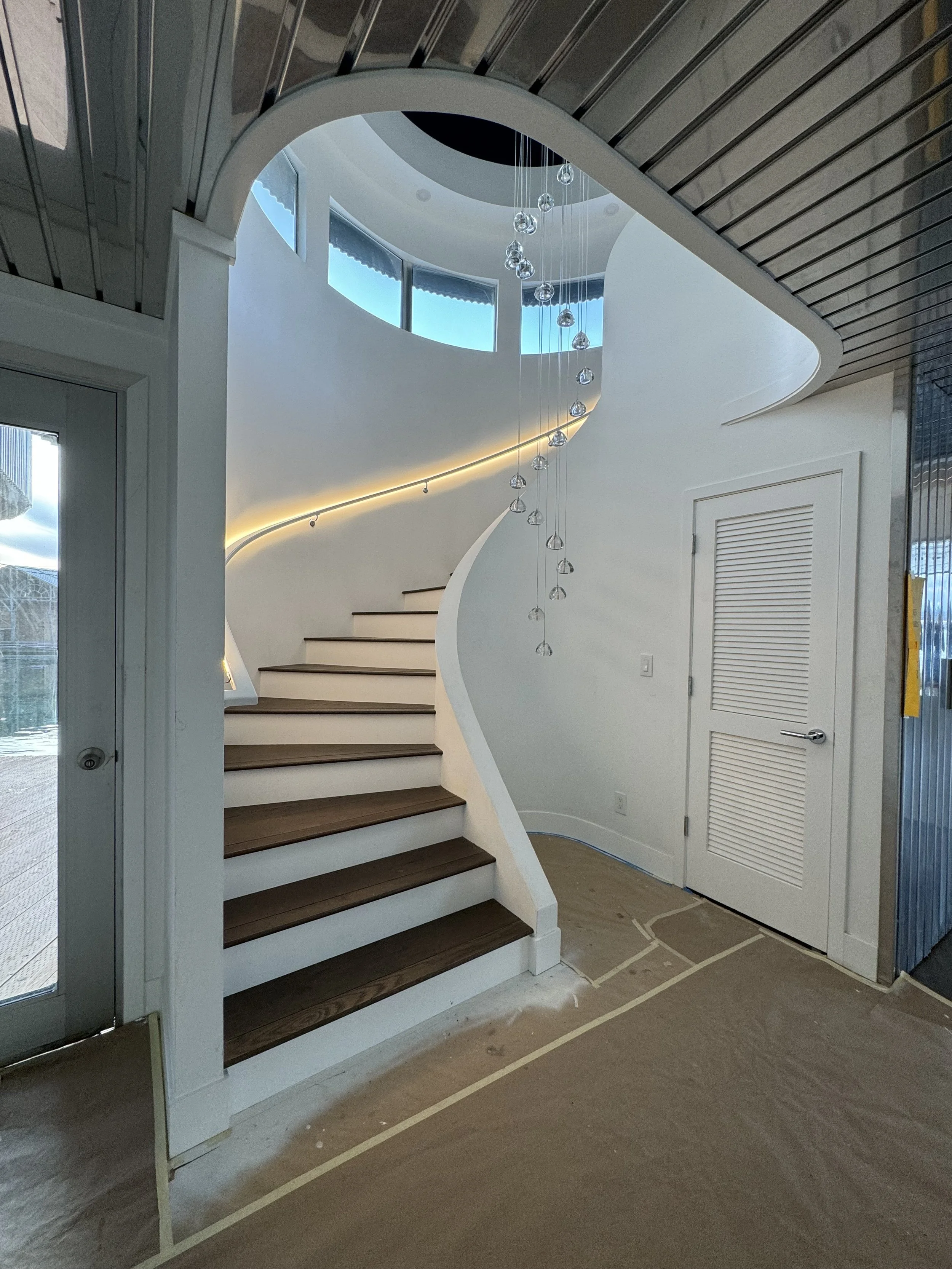 Modern interior staircase with wooden steps and white sides, a curved wall with a built-in light strip, hanging glass pendant lights, large circular window, and a partially visible door on the right.