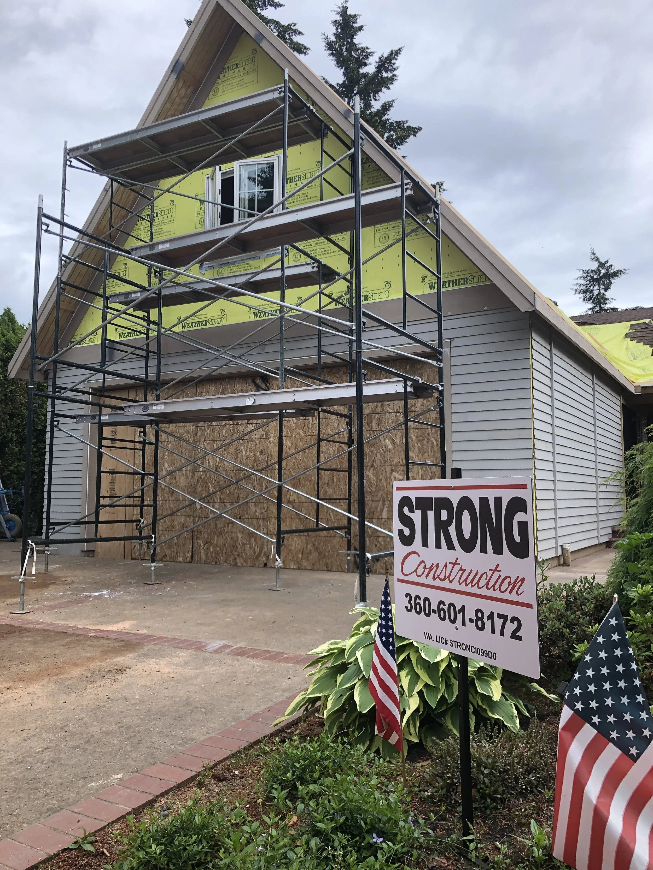 House under construction with scaffolding in front, plywood on the garage door, and a 'Strong Construction' sign with a phone number in the yard, American flags, and plants.