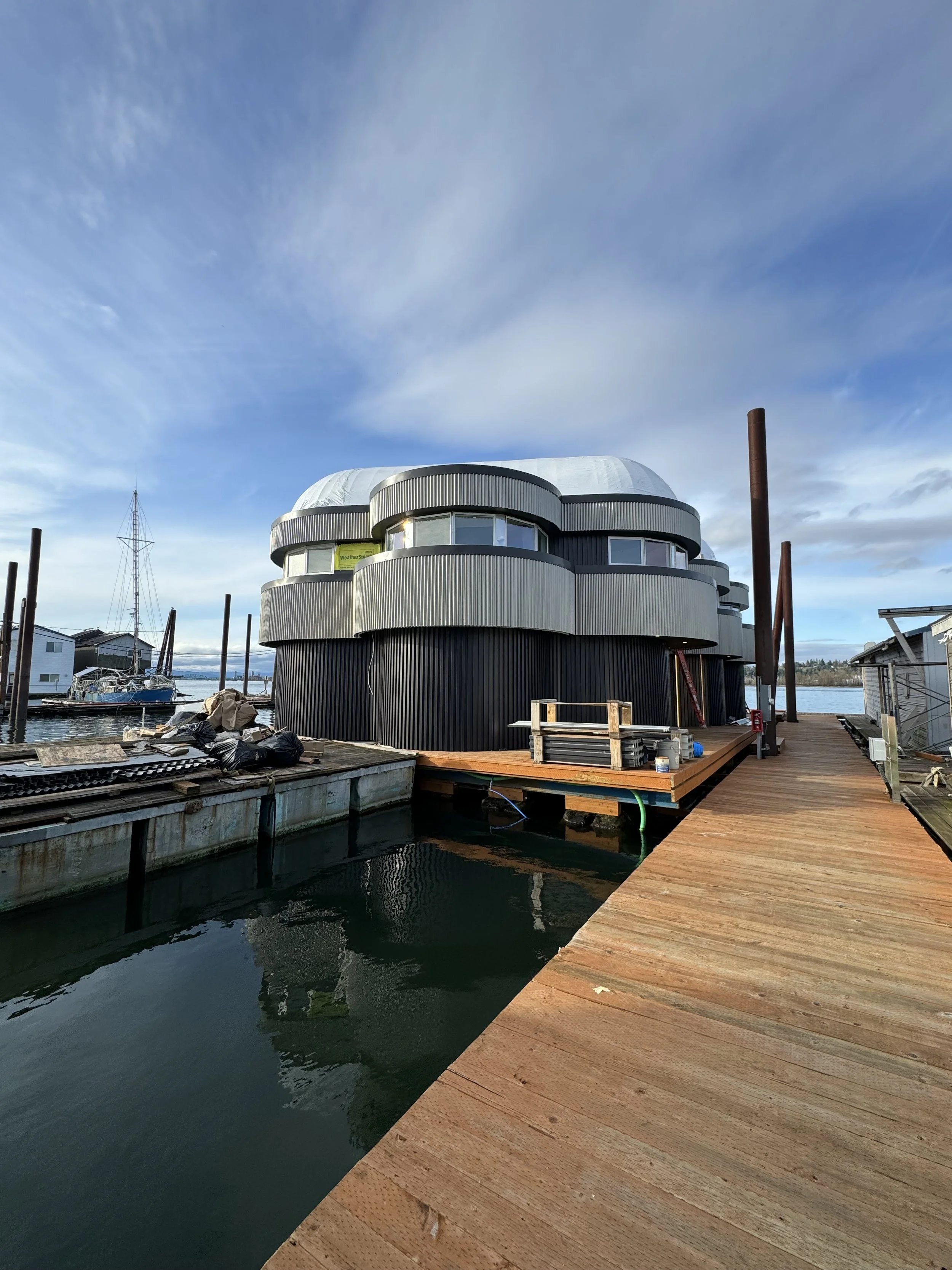 Modern house under construction by the water with a wooden dock in the foreground, surrounded by boats and construction materials.