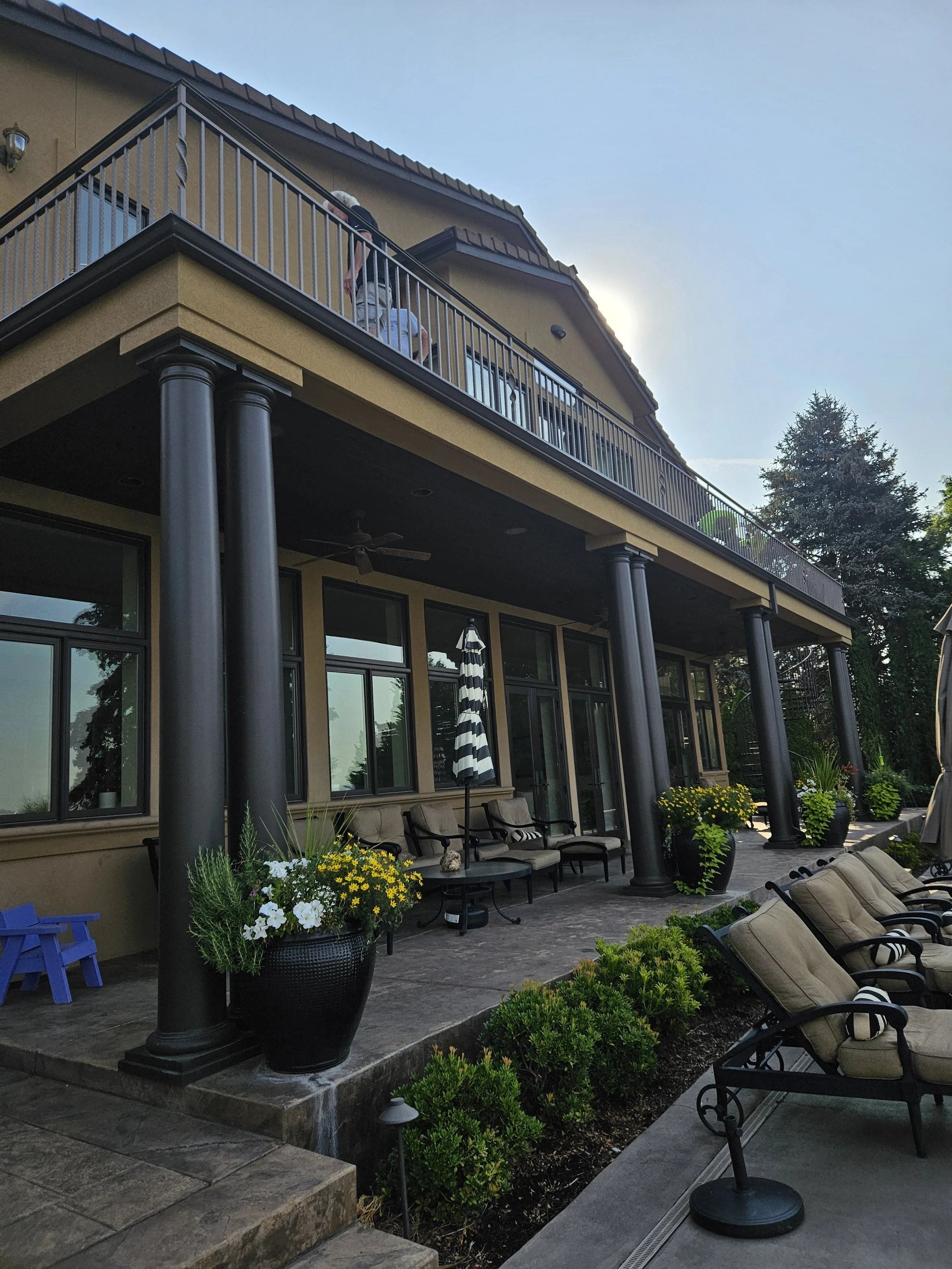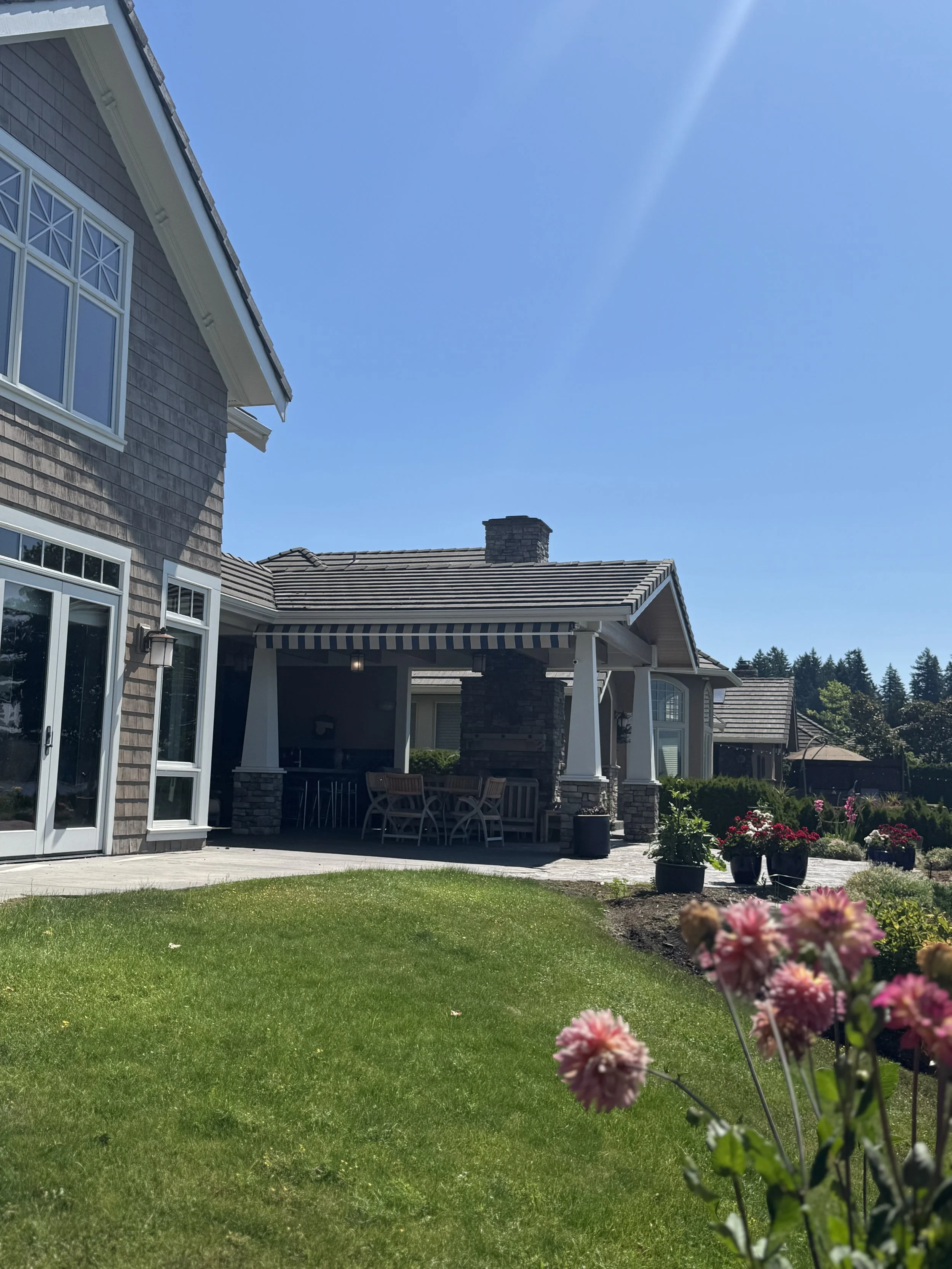 A backyard patio area with a table and chairs, surrounded by potted flowers and greenery, attached to a house with large windows and a sliding glass door, under a clear blue sky.