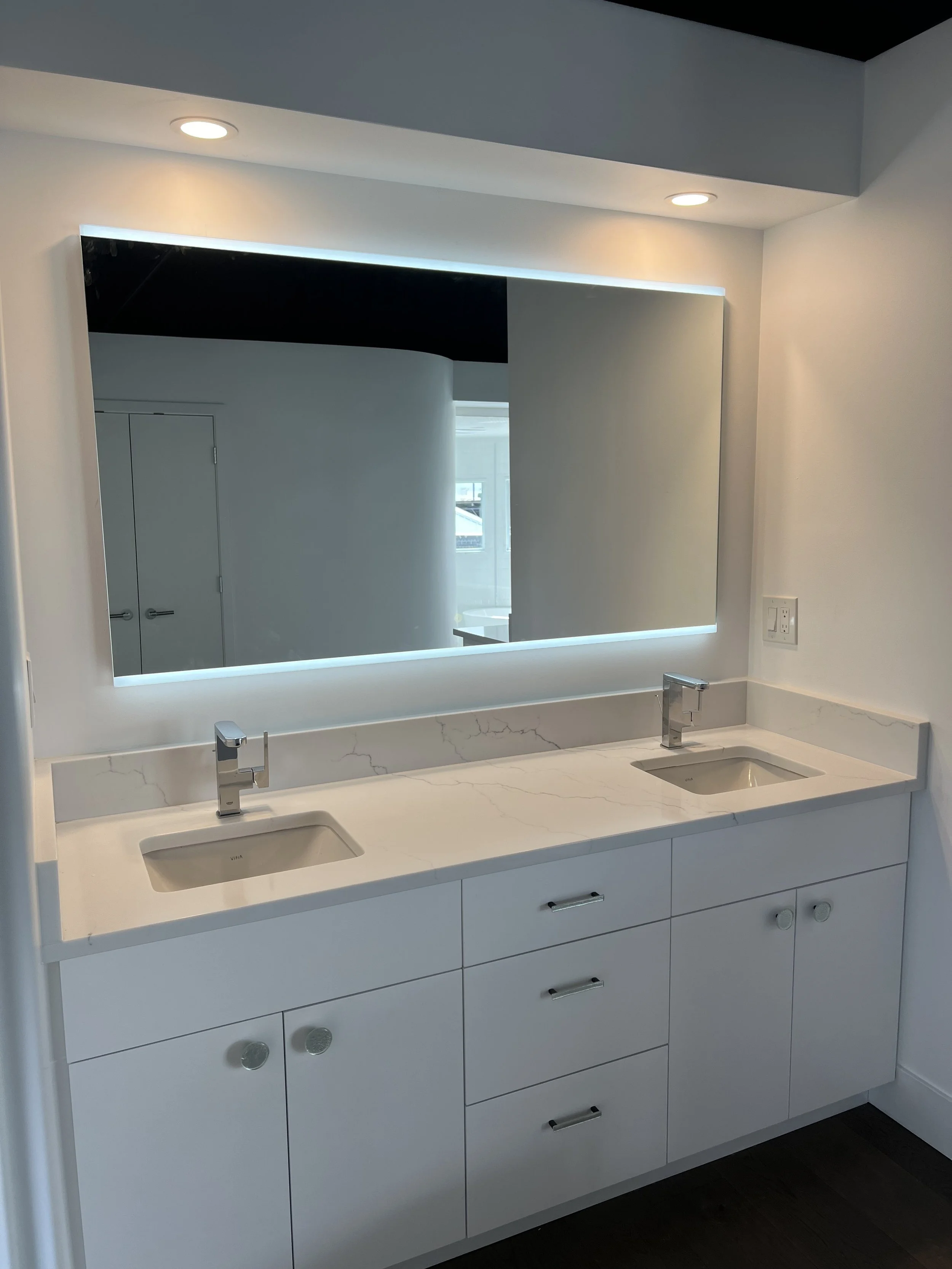 Modern bathroom vanity with two vessel sinks, mirrors, pendant lights, a large glass vase, and folded towels.